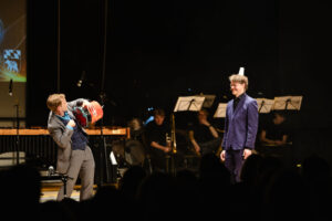 Mit einem Ruben´schen Flammenrohr – in der Show als „gigantischer Grill“ präsentiert – machte Kim nicht nur Odilos Posaunenklängen als stehende Wellen sichtbar, sondern ließ sie später zu den Klängen zum sehr coolen Big Band-Sound regelrecht tanzen. Hier vermengten sich Naturphänomen mit Musik zu einer Pyro-Show!