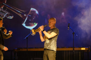Es war eine seltene Gelegenheit für unser Publikum, das eigene Wissen zum Phänomen Schall in die sichtbare Welt zu bringen. Dafür ging Jürgen Wüst, Stellvertretender Musikschulleiter und Trompeter aus vollstem Herzen, auch ungewöhnliche Wege: So tauchte er beispielsweise den Schalltrichter seiner Trompete in einer Seifenflüssigkeit – um nicht nur eine sehr große, sehr lang haltende, Seifenblase, sondern auch einen wunderbaren Ton zu erzeugen!